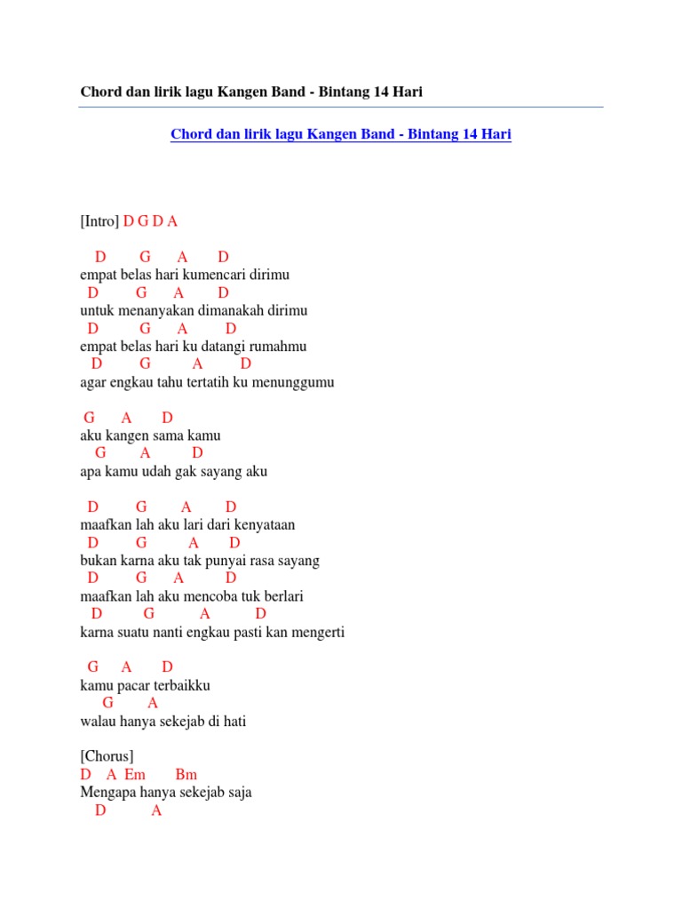 Chord Dan Lirik Lagu Kangen Band Bintang 14 Hari